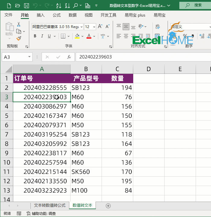 先选中订单数据区域单元格,点击【易用宝】→【转换】→【数值转文本型数字】。