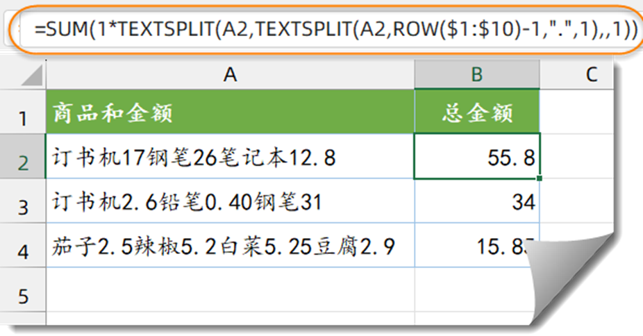 如下图所示,A列是商品和金额的混合信息,希望提取出其中的金额部分,并进行求和汇总。
