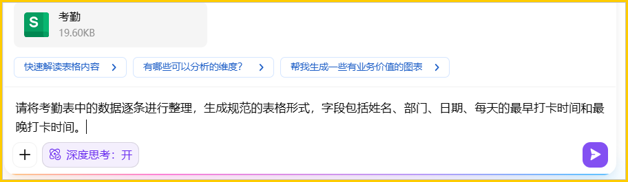 单击对话框右下角的上传按钮,将考勤表文档上传,然后发送以下指令: