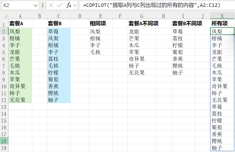=COPILOT(“提取A列与c列出现过的所有的内容”,A2:C12)