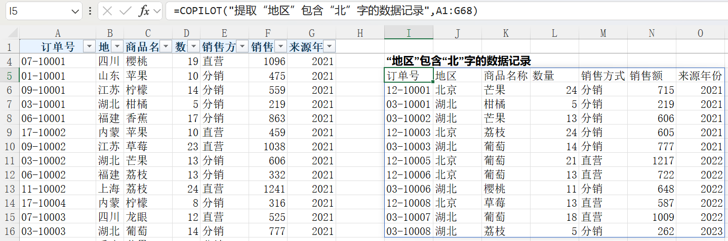 =COPIOLOT(“提取‘地区’里面包含‘北’字的数据记录”, A1:G68)