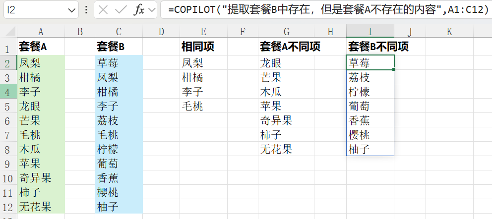 =COPILOT(“提取套餐B中存在,但是套餐A不存在的内容”,A1:C12)