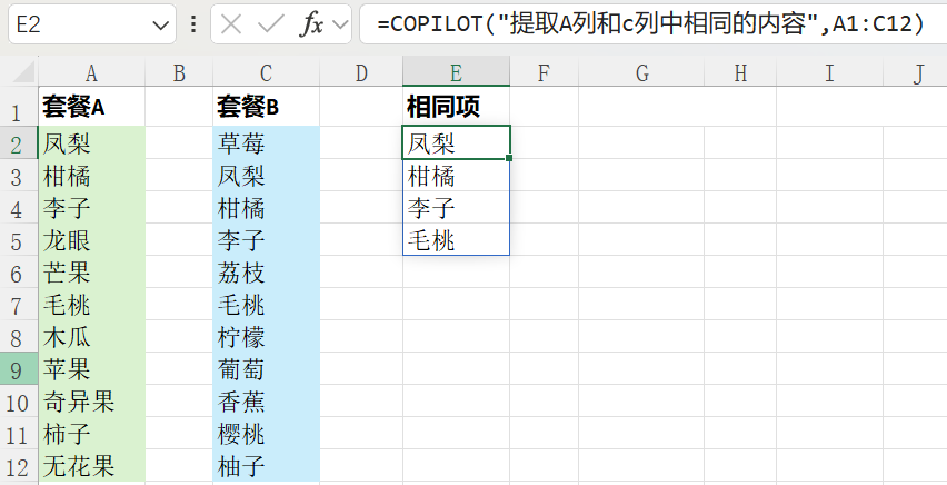 =COPILOT(“提取A列和c列中相同的内容”,A1:C12)