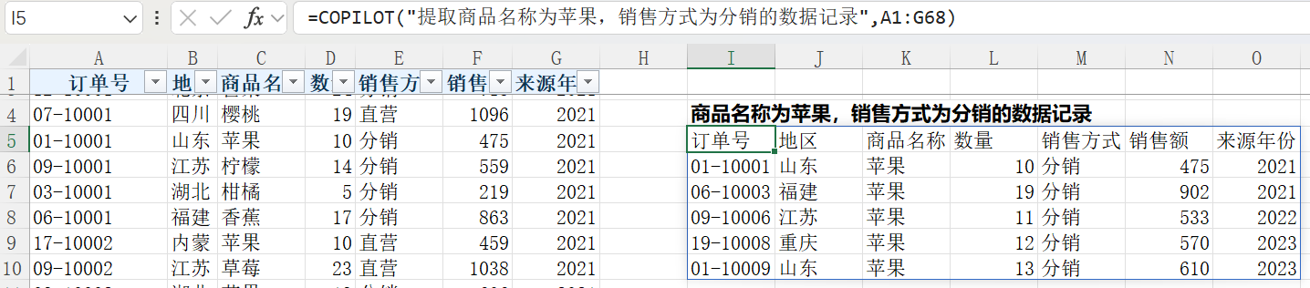 =COPIOLOT(“提取商品名称为苹果,销售方式为分销的数据记录”, A1:G68)