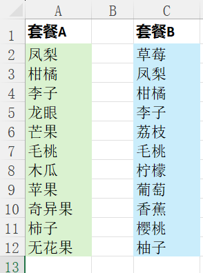 假设我们有“套餐A”和“套餐C”两列水果名单: