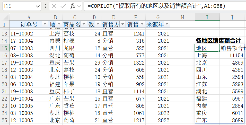 =COPIOLOT(“提取所有的地区以及销售额合计”, A1:G68)