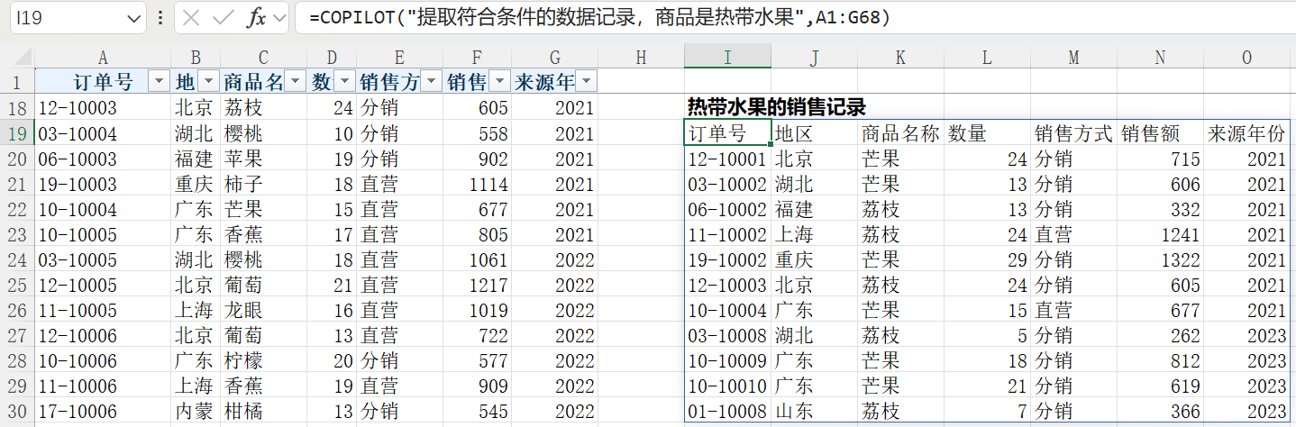 =COPIOLOT(“提取符合条件的数据,商品是热带水果”, A1:G68)