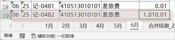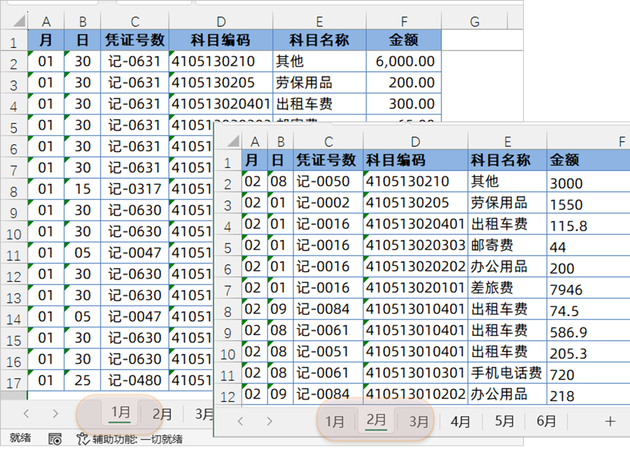 如下图所示,是某公司上半年的一些凭证记录,不同月份的数据结构一致,分别存放在以月份命名的工作表里。现在,需要把这些记录合并到一起,便于后续的统计汇总。