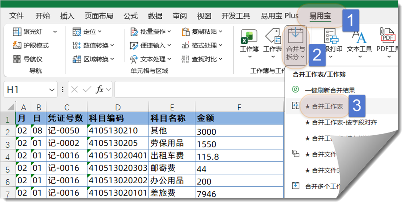依次单击【易用宝】→【合并与拆分】→【合并工作表】命令,如下图所示。