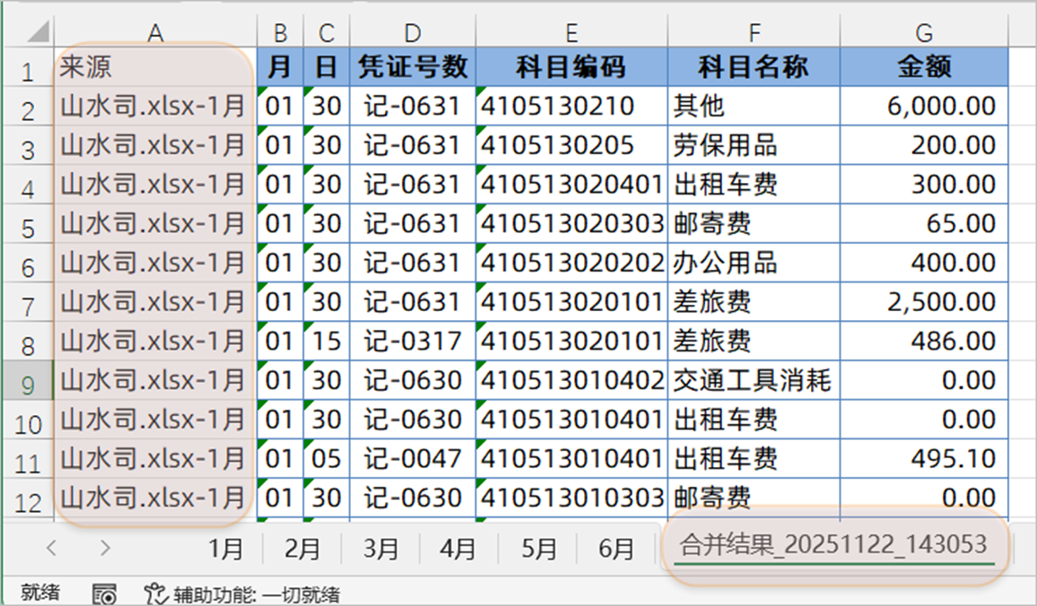 片刻之间,易用宝就完成了表格合并。自动插入一个带有操作日期时间的合并结果工作表,并且加上了来源字段。