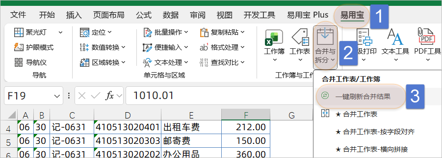 接下来,依次单击【易用宝】→【合并与拆分】→【一键刷新合并结果】命令即可。