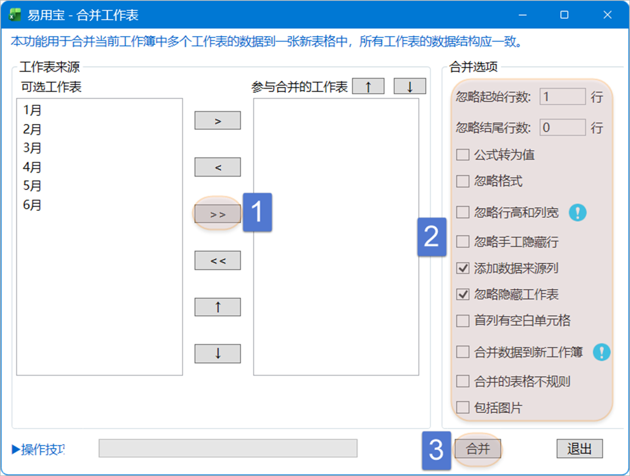 在右侧的【合并选项】区域中,工具需要来进行必要的设置。这里咱们选择的是忽略起始行数为1行,也就是合并时不保留多余的标题行。然后选择【添加数据来源列】,最后单击【合并】按钮。