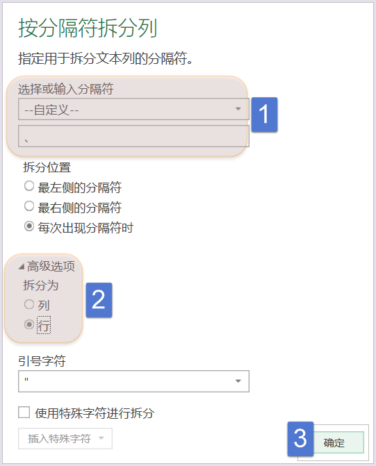 在弹出的对话框中,默认会自动识别分隔符,检查无误后单击【高级选项】,选择拆分为“行”,单击【确定】按钮: