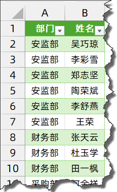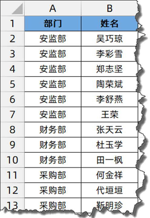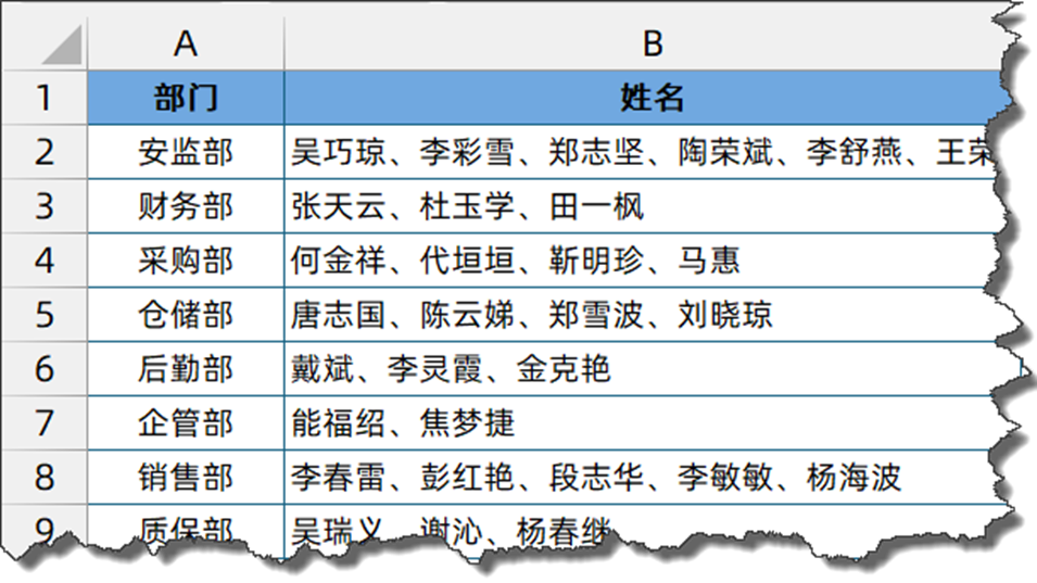 如下图所示,是某单位的人员名单,A列是部门名称,B列则是该部门的全部员工姓名。