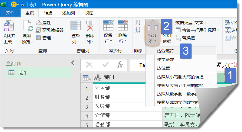 接下来单击【姓名】列的列标,再依次单击【主页】→【拆分列】→【按分隔符】命令: