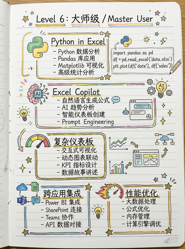 核心技能: Python in Excel(利用Python进行高级数据分析与可视化),Excel Copilot(通过自然语言生成公式、分析趋势、创建仪表板),高级Prompt Engineering(AI指令优化),构建复杂的数据可视化和交互式仪表板,跨应用(如Power BI)集成。