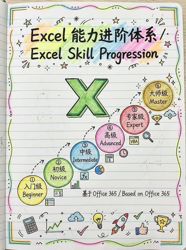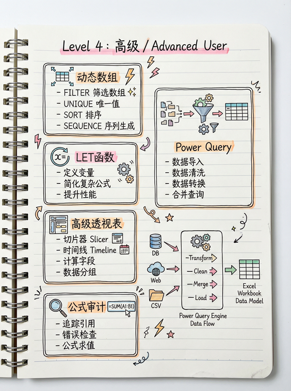 核心技能: 动态数组公式(FILTER, UNIQUE, SORT, SEQUENCE等),LET函数,高级数据透视表(切片器、时间线),创建和定制高级图表,Power Query(数据导入、转换与清洗),错误检查与公式审计。
