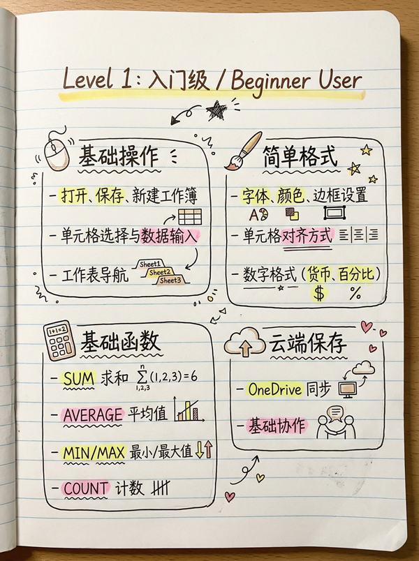 核心技能: 基本操作(打开、保存、输入数据),单元格与区域选择,基础格式设置(字体、边框、对齐),简单加减乘除运算,基础函数(SUM, AVERAGE, MIN, MAX),工作表导航。