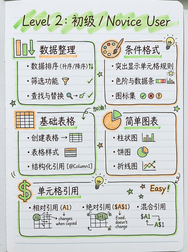 核心技能: 基础数据整理(排序、筛选),条件格式(突出显示单元格),创建和管理基本表格,简单的图表制作(柱状图、饼图),单元格引用(相对、绝对)。