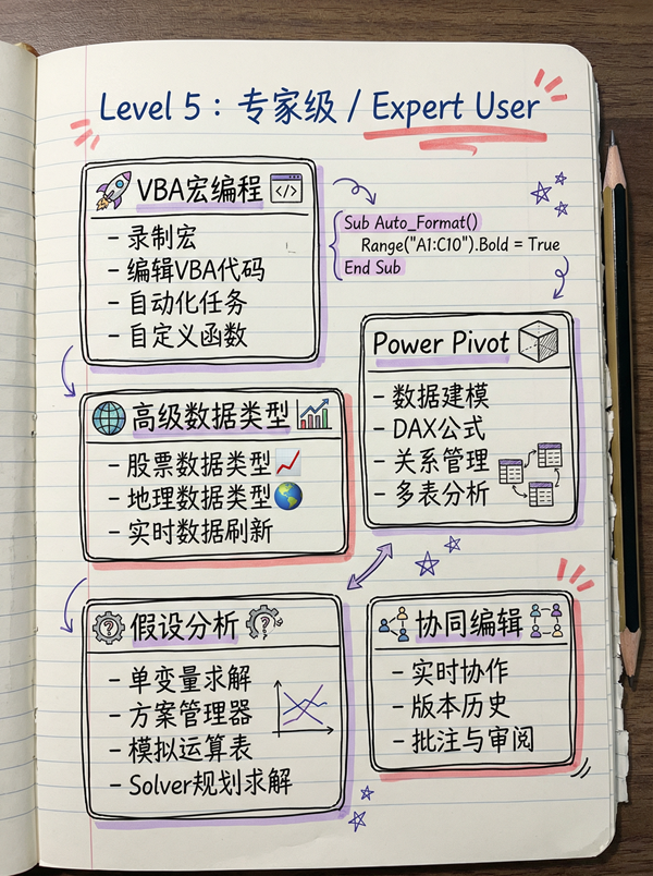 核心技能: 宏与VBA编程(自动化重复任务),Power Pivot(数据建模、DAX公式),高级数据类型(股票、地理),外部数据源连接,“假设分析”工具(单变量求解、方案管理器),工作簿保护与数据完整性。