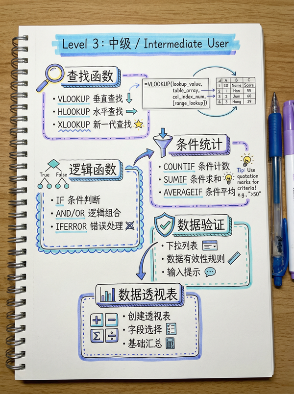 核心技能: 掌握查找与引用函数(VLOOKUP, HLOOKUP,以及XLOOKUP的初步应用),IF函数与逻辑判断,COUNTIF, SUMIF等条件函数,数据验证,基础数据透视表(创建与字段选择)。