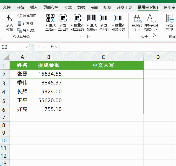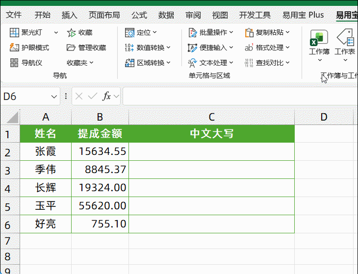 复制金额到C列。选中C列区域,依次单击【易用宝】→【数值转换】→【数字转中文大写金额】。