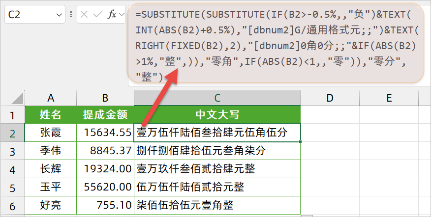 SUBSTITUTE(SUBSTITUTE(IF(B2>-0.5%,,”负”)&TEXT(INT(ABS(B2)+0.5%),”[dbnum2]G/通用格式元;;”)&TEXT(RIGHT(FIXED(B2),2),”[dbnum2]0角0分;;”&IF(ABS(B2)>1%,”整”,)),”零角”,IF(ABS(B2)<1,,”零”)),”零分”,”整”)