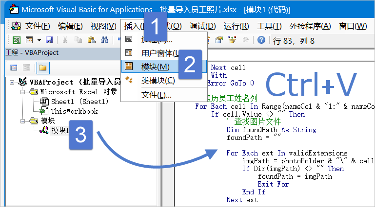 插入→模块,在模块窗口中粘贴代码。