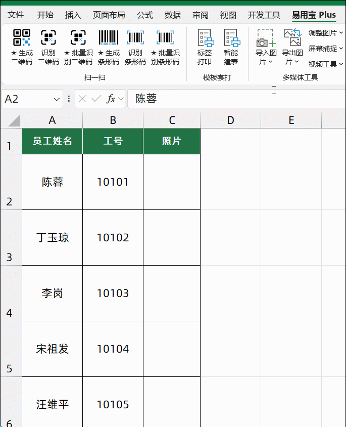 选中姓名所在区域,依次单击【易用宝Plus】→【导入图片】→【按名称导入图片】命令。